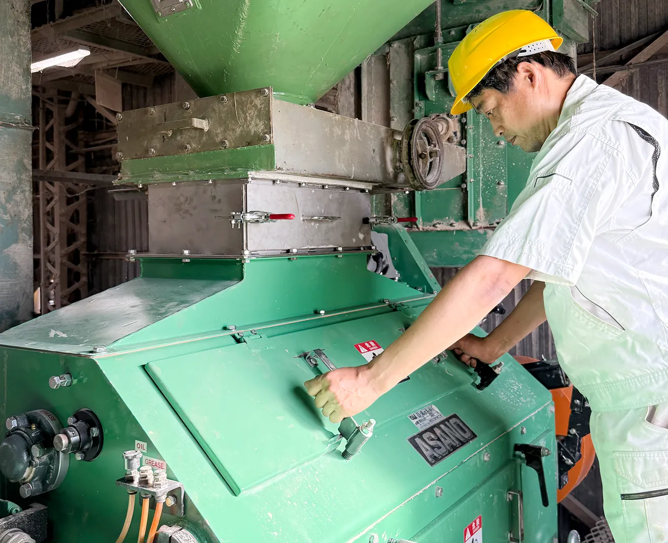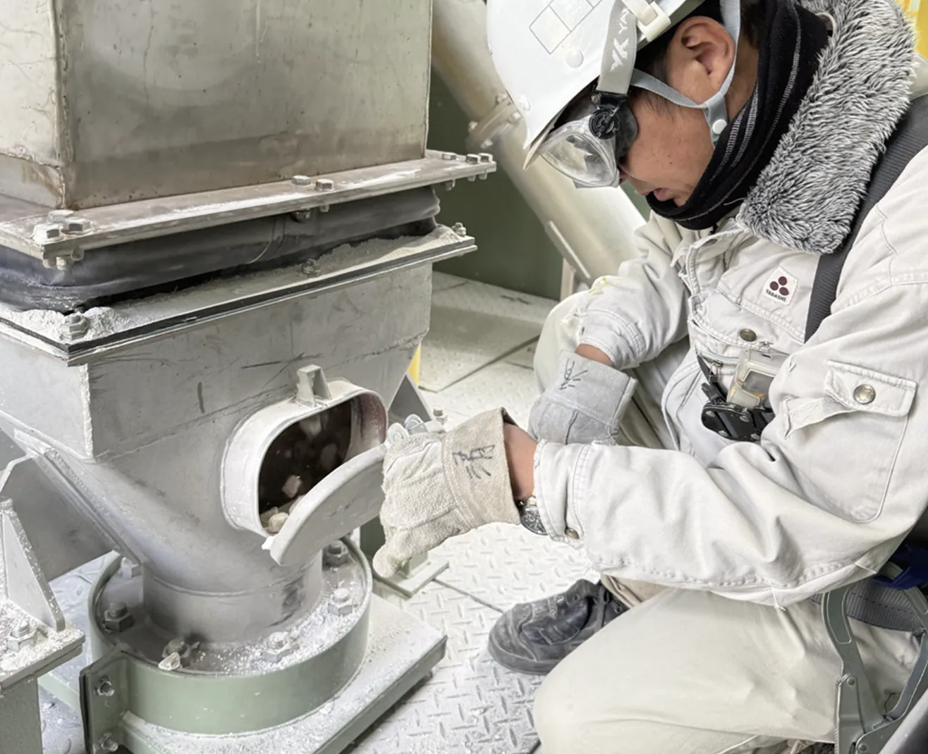 生石灰製造工場で、製品をサイズ別にふるい分けしています。